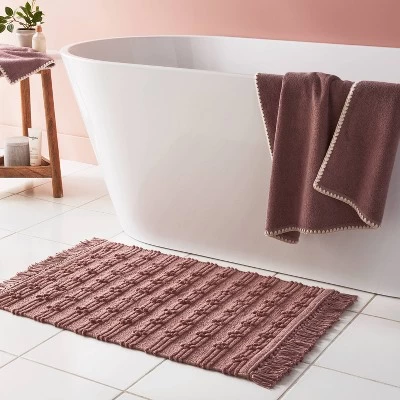 Transform your bathroom with this Dotted Striped Bath Rug from Threshold™. The woven bath rug is crafted from cotton fabric to provide soft comfort underfoot every time you step out of the shower or bath. Designed in a mauve hue with dotted stripes and tassel edges for charming flair, you can place the flat-pile rug by the tub or in front of the sink to bring style, convenience and comfort to your bath space.