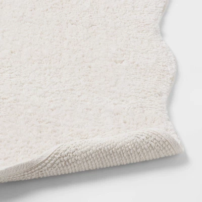 Enhance your bath space in charming style with this Scallop Bath Rug from Threshold™. The tufted bath rug is crafted from cotton fabric to provide soft comfort underfoot as you step out of the bath or shower. Designed in a tan hue with scalloped edges, you can place the novelty bath rug by the tub or in front of the sink to bring style and luxurious comfort to your bathroom.