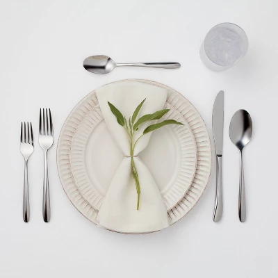 Beautiful and timeless, the liquid shine of the Threshold Kayden Silverware Set will add finesse to any table setting. This 20-piece dishwasher safe set of silverware is a subtle departure from traditional flatware. It has rounded edges and a thoughtful sizing that you’ll love using for years to come. This set includes 4 dinner spoons, 4 salad forks, 4 dinner forks, 4 dinner knives and 4 teaspoons.