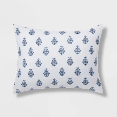 Bring a refreshing and soothing look to your bedroom with the Norwood Block-Print with Border Comforter Bedding Set from Threshold™. The white comforter is adorned with an allover floral block print in blue shades, and is framed by a coordinating border for an appealing touch to liven up your room instantly. The set includes a square and a rectangular decorative pillow with stripes or a border design, as well as a matching pillow sham, that coordinate with the top of the bed for a cohesive look. This comforter bedding set features a year-round fabric construction for comfortable use. Pair it with white bedsheets to enhance the fresh and clean look, and toss in throw pillows in coordinating colors and patterns to finish a lovely setting.