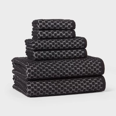 Complete your bath essentials with this 6-Piece Performance Plus Textured Dot Bath Towel Set from Threshold™. Made from 100% cotton with a terry construction, this midweight towel set includes two bath towels, two hand towels and two washcloths that feel soft against your skin while helping you keep clean and comfortably dry. Each towel is fashioned in a solid hue and adorned with textured dot patterns, and features low-lint treatment and fade-resistant protective qualities, helping them to keep looking like new ever after multiple washes. Plus, they come with loops for convenient hanging.