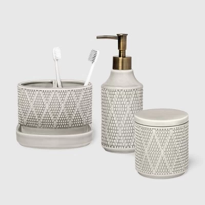 Add a touch of unique texture to your bath space while keeping your decor classically chic with the Canby Texture Bath Collection from Threshold™. This collection features essential pieces to finish your bath arrangement — an open-top organizer, soap pump and lidded canister — all fashioned in a light gray color for a sleek and elegant look. The ceramic construction makes for long-lasting durability, while the textured finish and diamond pattern add extra flair to an otherwise simple design.