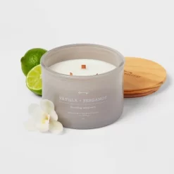 14oz Lidded Gray Glass Jar Crackling Wooden 3-Wick Candle With Clear Label Rose + Cedar – Threshold™