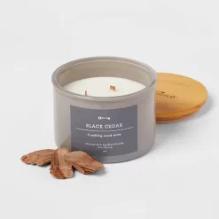 14oz Lidded Gray Glass Jar Crackling Wooden 3-Wick Candle With Paper Label Black Cedar – Threshold™