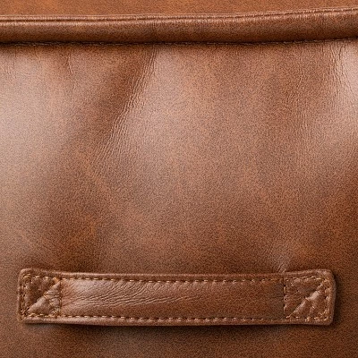 Make your living room look more inviting while adding some flexible seating with the Evanston Leather Cube Pouf from Threshold™ designed with Studio McGee. Covered in leather upholstery for a warm finish, this cube pouf is filled with foam to provide you a comfy spot to perch, and it also doubles as a footrest to rest your feet while sitting on your sofa. Featuring a classic square silhouette and a dark brown leather finish, it brings a striking update to your interior decor. Plus, the two side handles make it easier to move around your space for flexible seating or just rearranging the room.