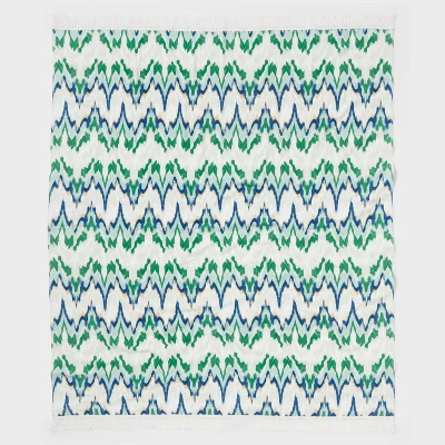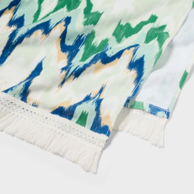 Enjoy a day of sunny beachside fun with this Ikat Green Jumbo Beach Towel from Threshold™. Made from 100% cotton, this oversized bath towel feels soft against your skin and helps you dry off quickly. Great for spreading on the sand or a chaise lounge, it features an ikat pattern in green, blue and tan hues on a cream background for a vibrant look, while fringed trim finishes the design with extra flair.