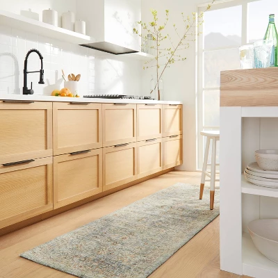 Give any room in your home a warm, welcoming vibe with this Ledges Digital Floral Print Distressed Persian Rug from Threshold™ designed with Studio McGee. Featuring a digital floral print and distressed detailing for a weathered, elegant look, this woven area rug is sure to give your decor a lovely update. Crafted from soft fabric with canvas backing for cozy underfoot comfort, this rug features a low pile height, making it a perfect pick for high-traffic areas in your home. Best of all, the neutral-color patterning makes the rug pair easily with just about any existing decor.