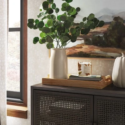 Add a touch of greenery to your home or office decor with this Preserved Eucalyptus Bundle from Threshold™. This decorative stem bundle features a bunch of dried, lush green eucalyptus leaves to bring a natural-themed look to your indoor space, and the artificial construction makes it maintenance free. Add to jars, tall vases or floral arrangements to create a welcoming display on any table.