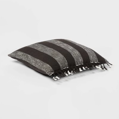 Elevate your living room seating with this Square Modern Woven Stripe Decorative Throw Pillow from Threshold™. This decorative pillow is designed with woven stripes in tonal black and a row of matching rigid tassels on one end for extra visual appeal. Featuring a 100% cotton shell with a soft polyester fiber filling, the square throw pillow adds the right amount of comfort and style anywhere you place it, be it on your sofa, chair or bench.