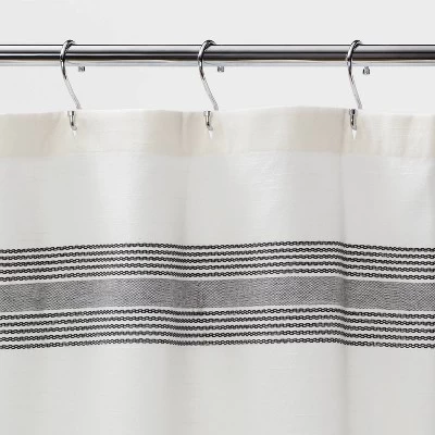 Update your bath space with the elegant flair of the Stripe Fringe Shower Curtain from Threshold™. Made from 100% cotton, this white shower curtain helps you keep your floors free from splashing water, and the gray and black striped pattern on the top and bottom of the curtain provides a timeless, versatile look. The fringed detailing on the bottom trim further enhances the visual appeal of this shower curtain, making it a functional and attractive addition to your bathroom. We’re committed to making products better for you, and the world. This product is Standard 100 by OEKO-TEX certified, meaning that everything from the dyes and fabrics to accessories like buttons and zippers are tested and verified as free from harmful levels of more than 300 substances.